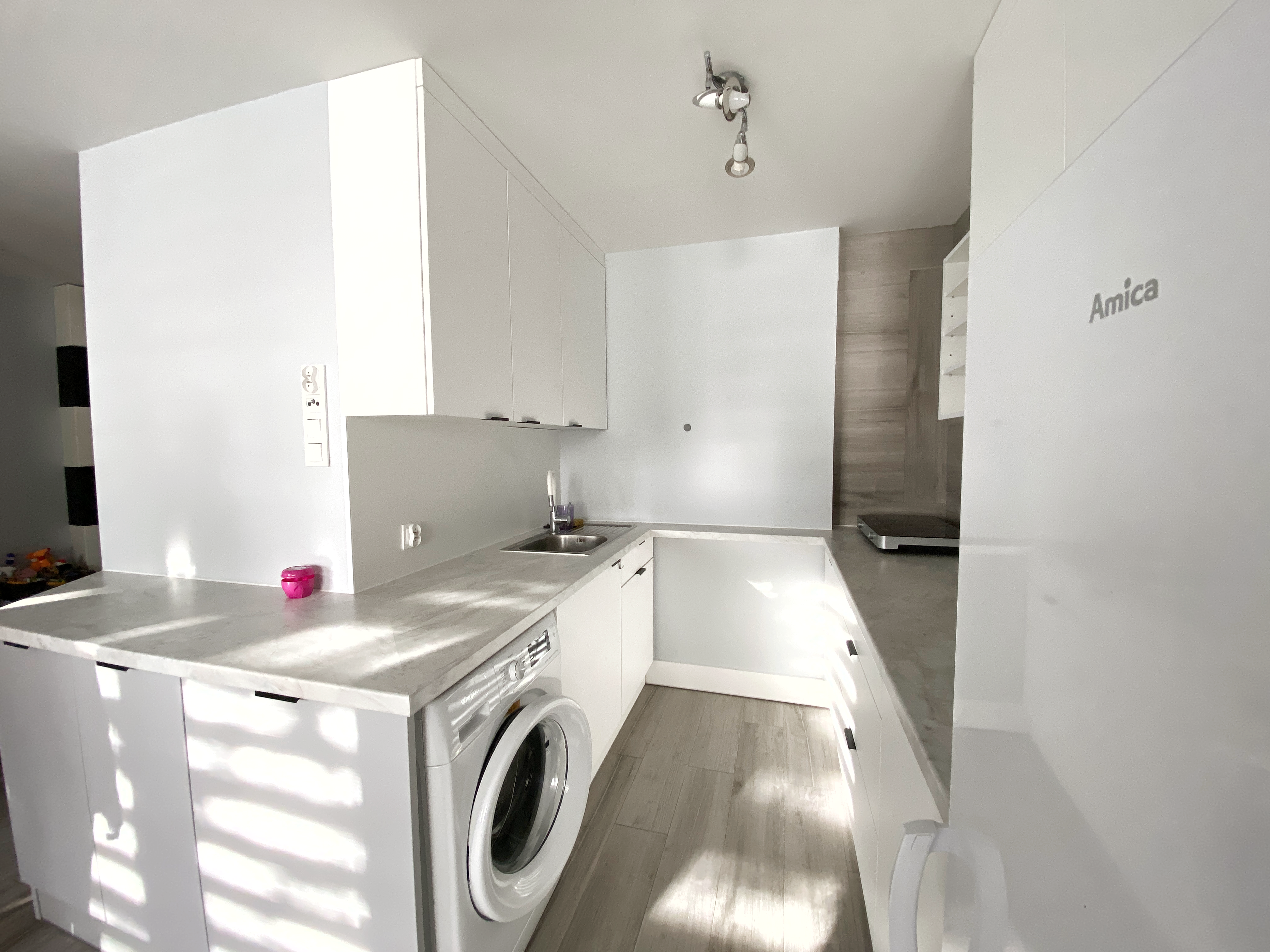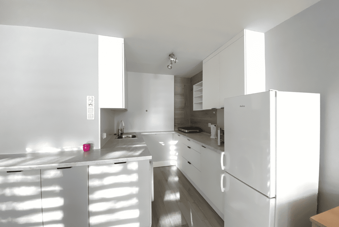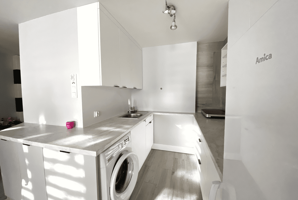 Kuchnia jest wyposażona w płytę indukcyjną na 2 stanowiska do gotowania, zlew jednokomorowy z ociekaczem, opiekacz oraz mikrofalówka. Pralka i duża lodówka jest na wyposażeniu mieszkania.