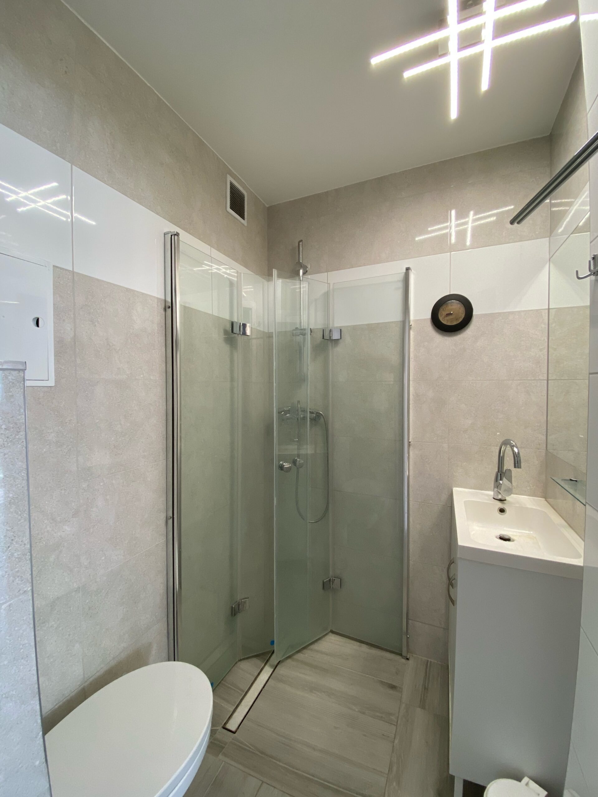 W łazience znajdziemy prysznic z łamanymi drzwiami sprytnie oszczędzający miejsce, gdy akurat z niego nie korzystamy. Umywalka z szafkami poniżej pomieści wszystko czego potrzebujesz. Nad umywalką znajduje się duże lustro.
