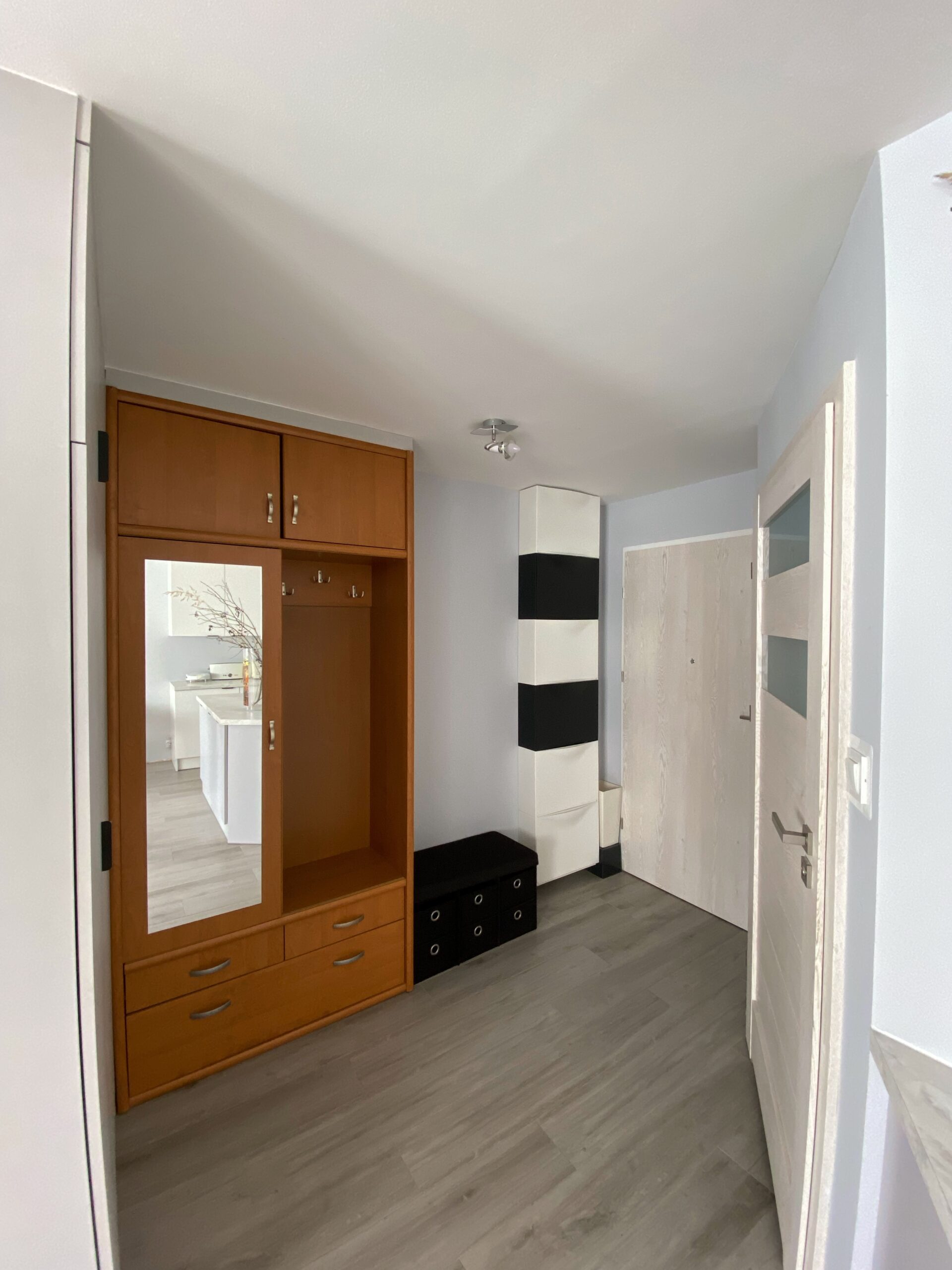 W przedpokoju mieszkania znajdują się dwie pojemne szafy (jedna z nich dzieli przedpokój od salonu, druga jest wolnostojąca) na odzież wierzchnią czy urządzenia gospodarcze itp. Na obuwie przewidziane są wysokie przegródki na prawej ścianie przedpokoju.