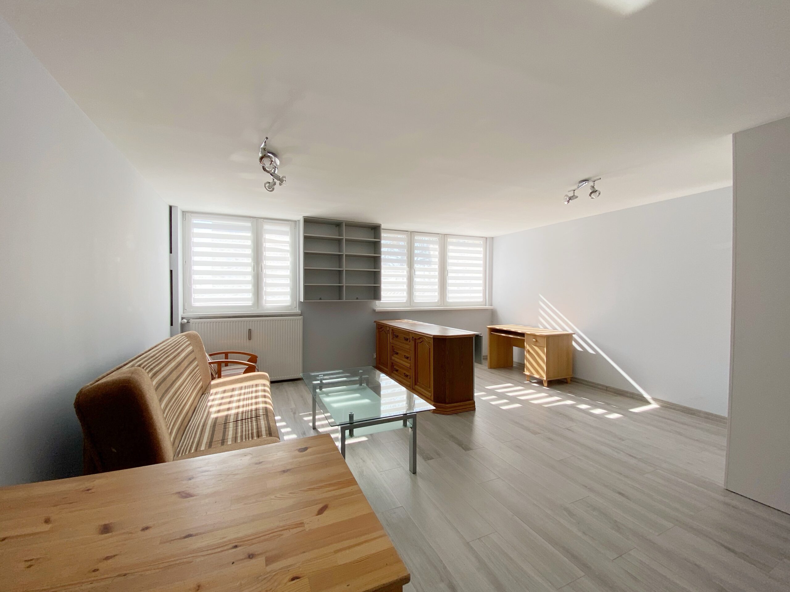 Salon jest bardzo jasny, daje dużo możliwości ustawienia mebli pod własny gust i potrzeby. W oknach zamontowane są rolety typu „dzień i noc”. Brak balkonu.