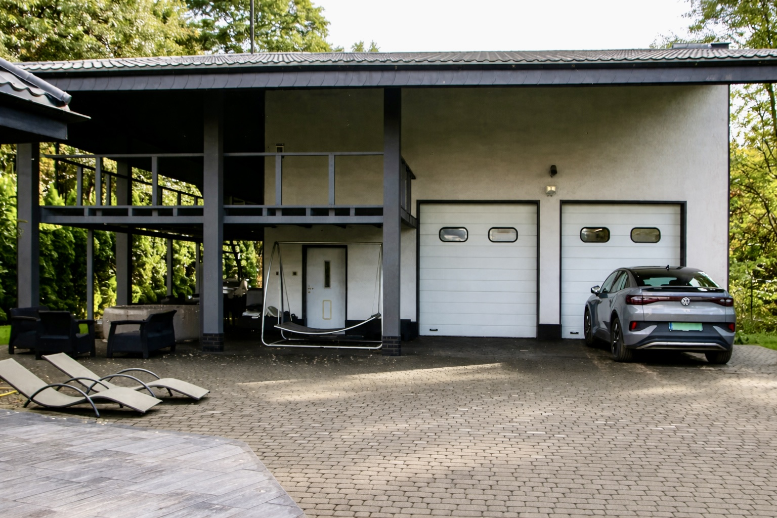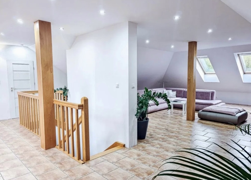 Piętrowy budynek garażowy to jedna z największych zalet tej nieruchomości. Wraz z miejscami na samochody i zapleczem technicznym, oferuje dodatkowe 120 m² przestrzeni, którą można przeznaczyć na mieszkanie gościnne, biuro, showroom lub działalność premium. To idealne rozwiązanie m.in. dla osób związanych z branżą motoryzacyjną – detailerów, mechaników klasy premium czy sportowców.