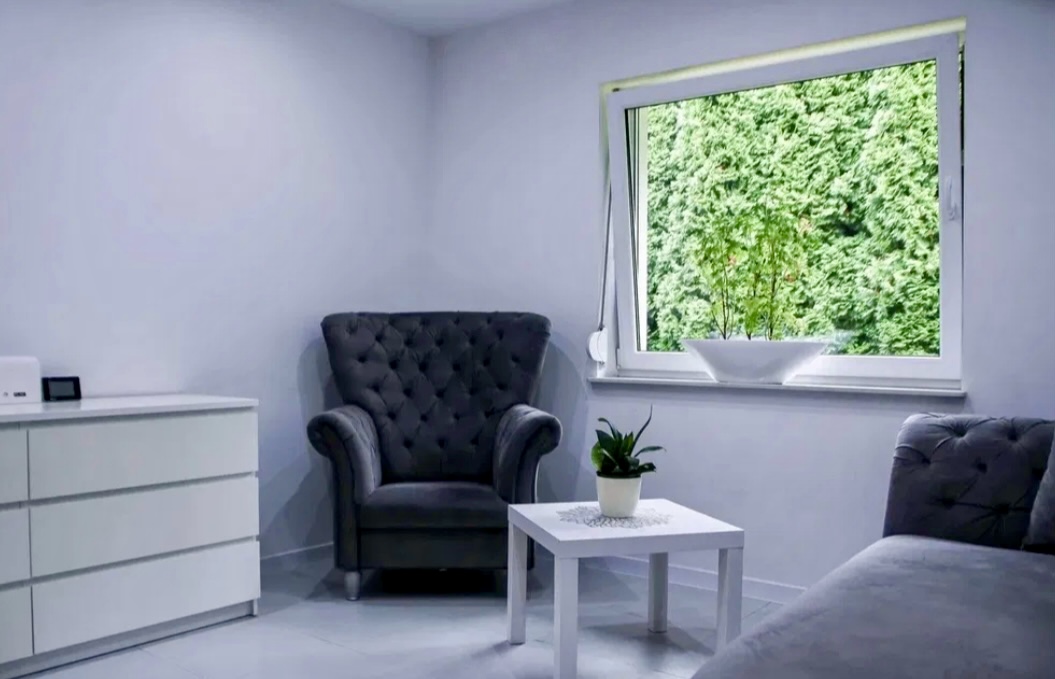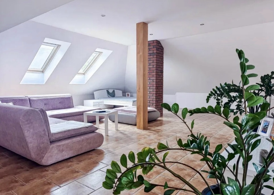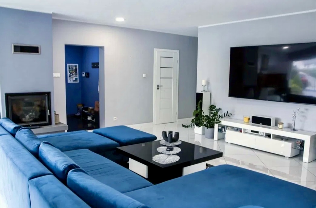 Wnętrze domu zostało urządzone z najwyższą dbałością o detale, w jasnej, eleganckiej kolorystyce. Przestronny salon wyłożony białymi kaflami płynnie łączy się z nowoczesną, otwartą kuchnią. W chłodniejsze dni przytulną atmosferę zapewnia kominek, a wygodna strefa wypoczynkowa sprzyja relaksowi i spotkaniom w gronie rodziny oraz przyjaciół.