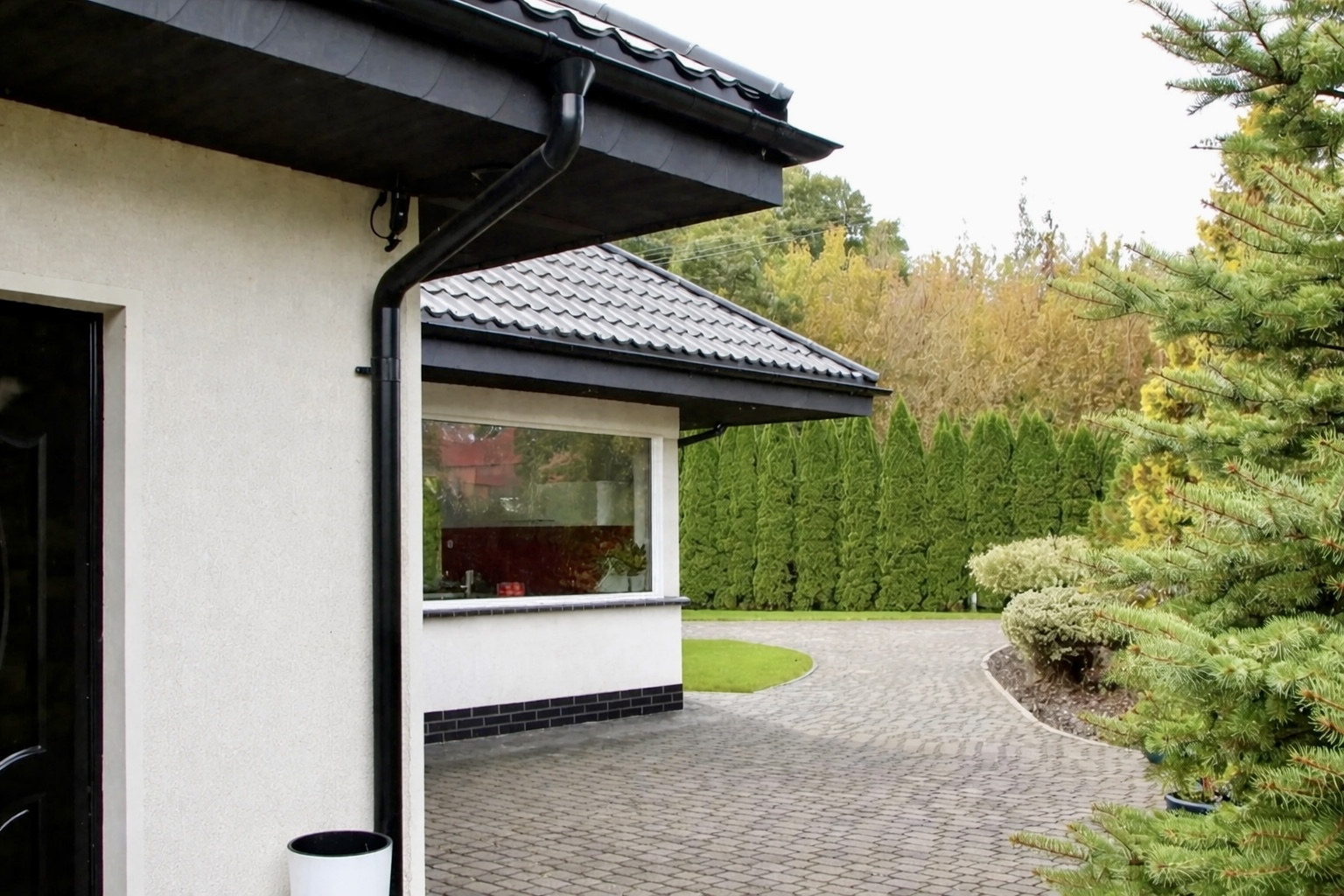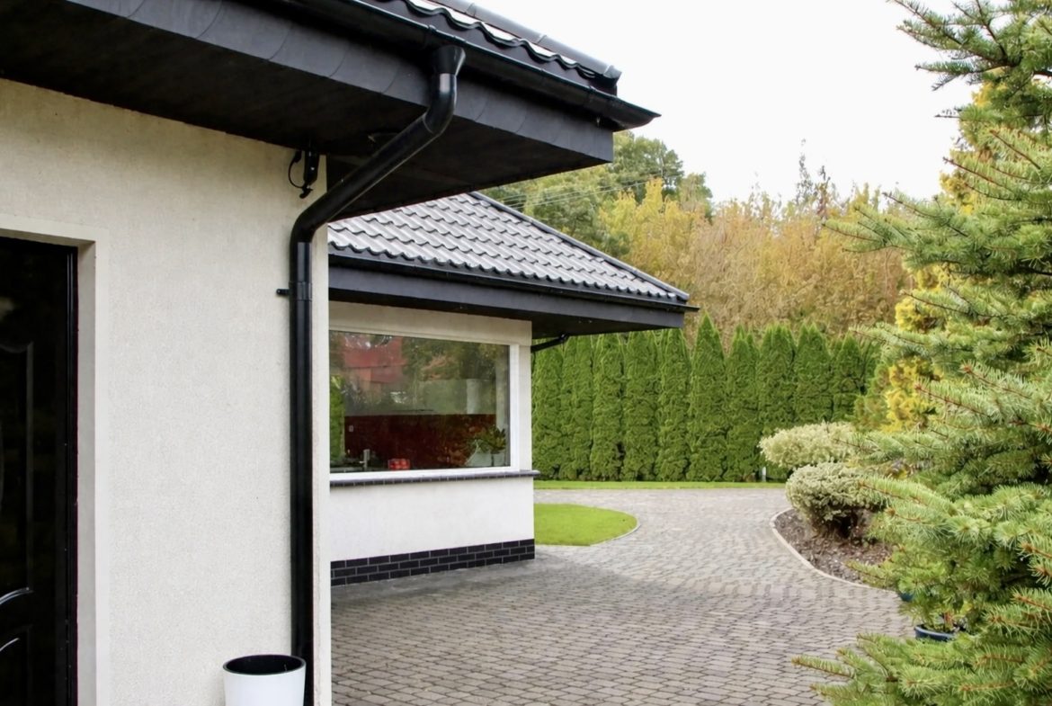 Wjazd na posesję prowadzi przez elegancko ułożoną kostkę brukową, a całość dopełnia zadbany trawnik i duża, dająca prywatność działka. Każdy element posesji został zaprojektowany z myślą o estetyce, wygodzie i funkcjonalności. Dom jest z trzech stron otoczony lasem co gwarantuje prywatność i możliwość odpoczynku w zaciszu pięknego ogrodu.