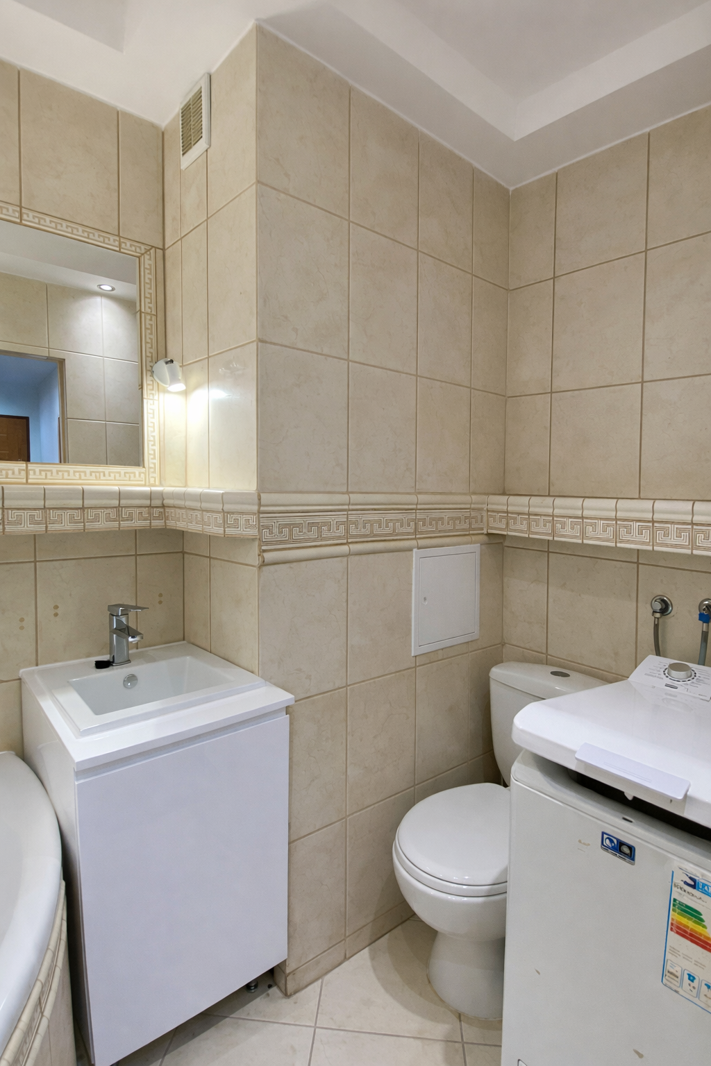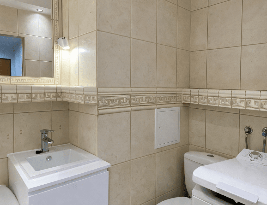 Łazienka połączona z toaletą została wyposażona w wannę narożną, umywalkę oraz pralkę z górnym wsadem. Mieszkanie jest częściowo umeblowane, co daje możliwość aranżacji według własnych potrzeb.